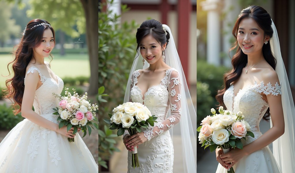 A beautiful Asian bride wearing a sexy white lace wedding dress holding wedding flowers, soft natural light, serene smile, romantic garden background.